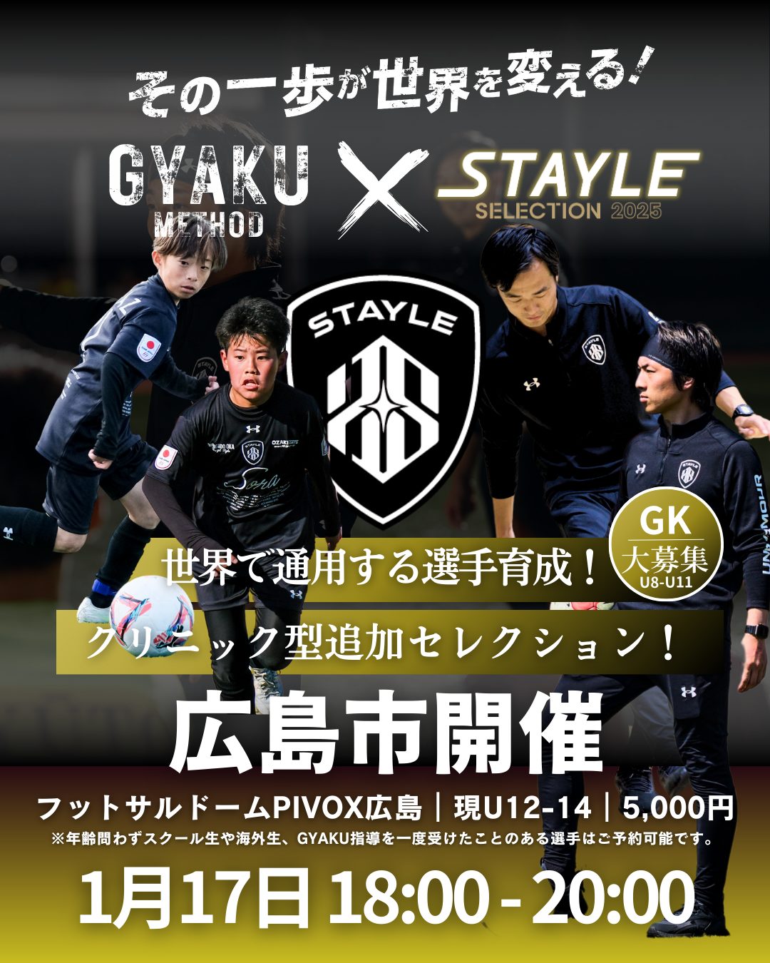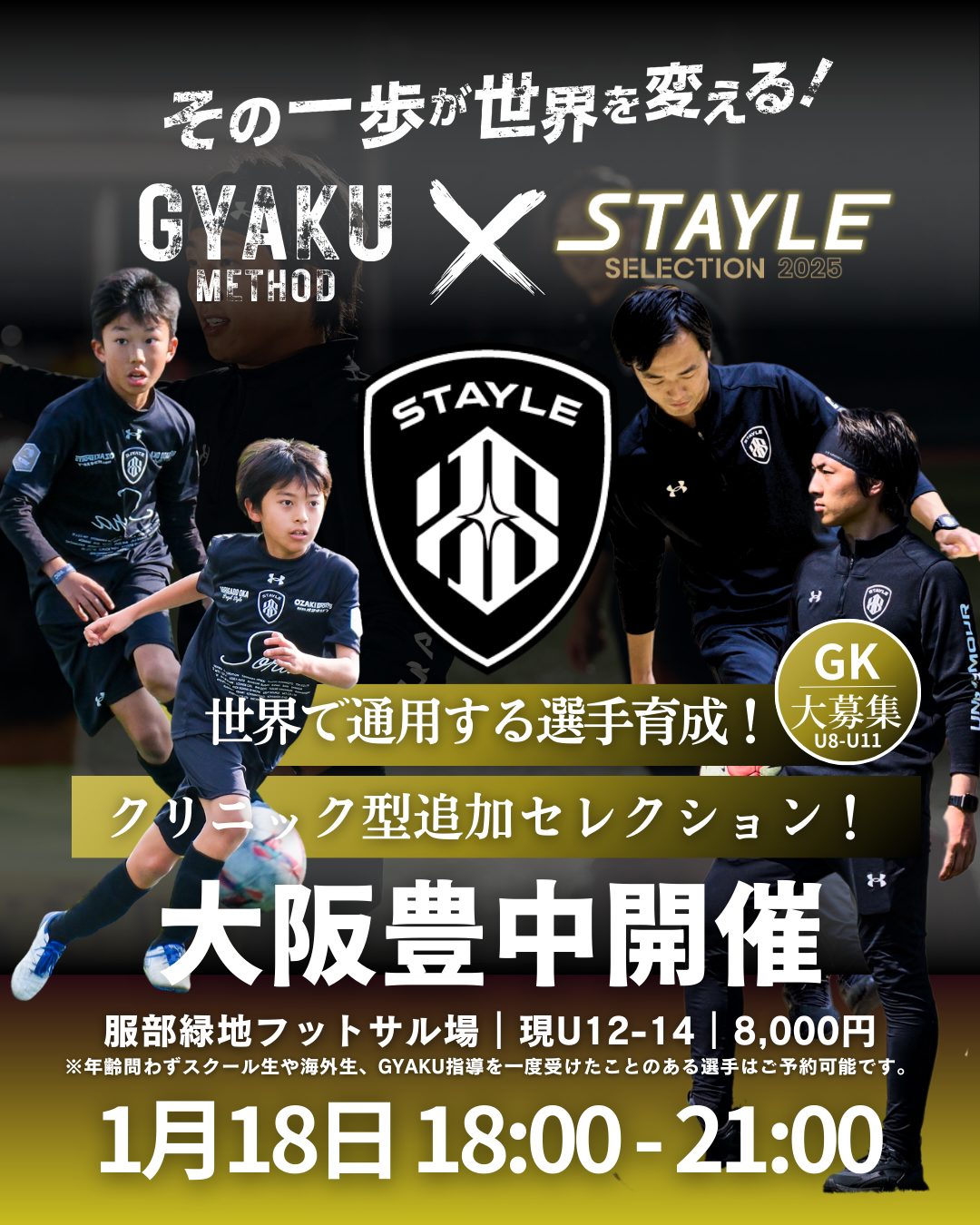 | 対象 | 現在小学6年生〜中学2年生 ※年齢問わずスクール生や海外生、GYAKU指導を一度受けたことのある選手はご予約可能です。(レベルや強度を上げて指導しますのでそれでも可能な選手) |