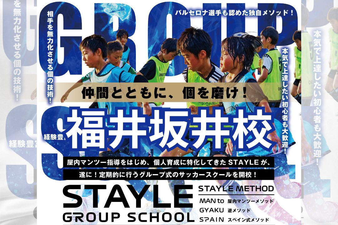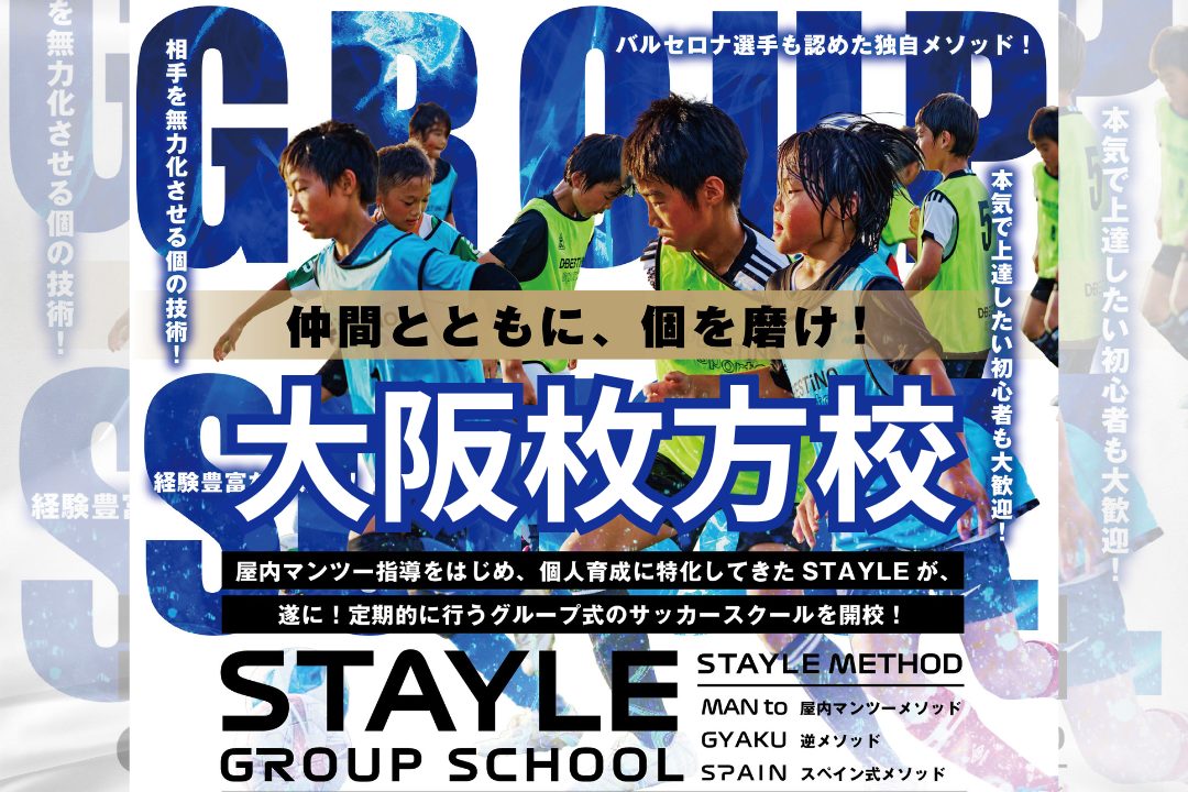 屋内マンツー指導ノウハウや相手の逆を取るための技術、スペイン式も取り入れた独自の個人育成型のSTAYLE METHODを中心に指導します。マンツー指導では出来ない対人の部分で、マンツー指導とグループ指導でより上達に繋げていきます。もちろん!マンツーマン生徒以外の選手の為にも、マンツーマンは中々行けないが我々の指導を学びたいと思っている選手の為にも、個人育成に必要な技術を定期的に指導するために開校することになりました。